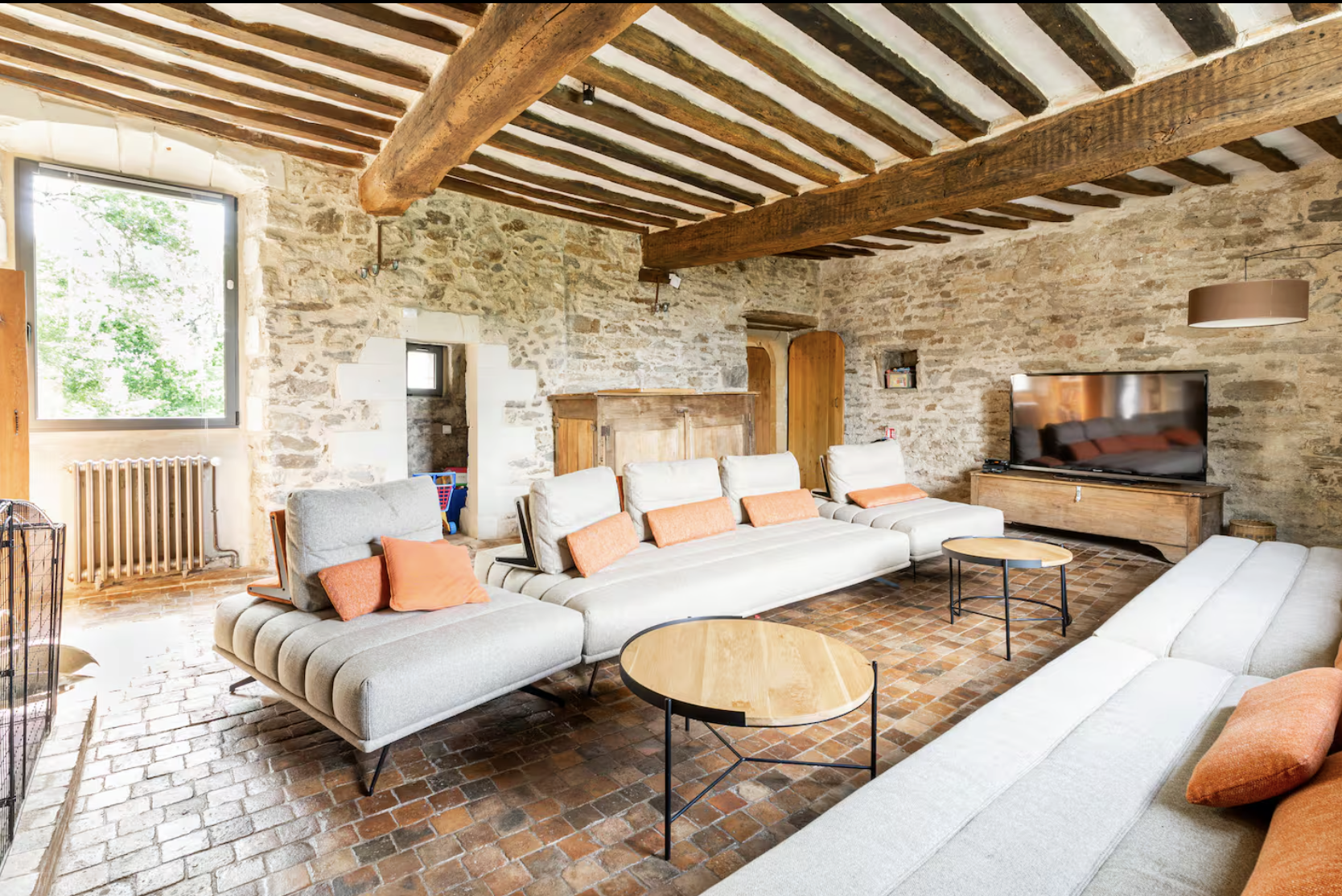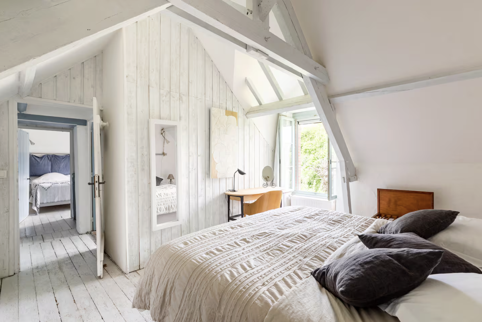 Le Cottage a gardé tout le charme de la maison de campagne, comme le sol de la cuisine en vieilles tommettes ou ses plafonds en poutres apparentes, ou encore ses nombreux murs peints à la chaux. The Cottage has retained all the charm of a country house, such as the kitchen floor made of old terracotta tiles, its exposed beam ceilings, and its many lime-painted walls.